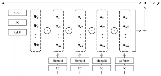 where denotes the k-th convolution kernel, ∗ represents the convolution operation, and ⊗ indicates element-wise multiplication. , , , and correspond to the kernel-wise, output-channel-wise, input-channel-wise, and spatial-wise attention weights, respectively.