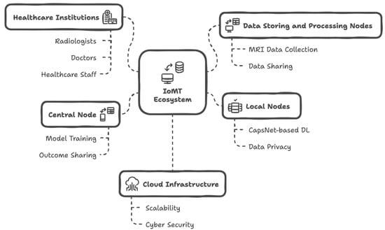 Furthermore, it is essential to note that the development of an FL-based ecosystem can positively impact MRI data sharing. To address these open problems and foster innovative research, establishing an FL ecosystem within an Internet of Medical Things (IoMT) architecture can be highly effective. This study aims to utilize a multi-institutional IoMT framework in which MRI data can be shared in a structured manner, facilitating DL-based brain tumor diagnosis within a CapsNet-driven federated learning framework.