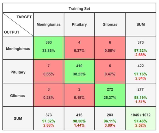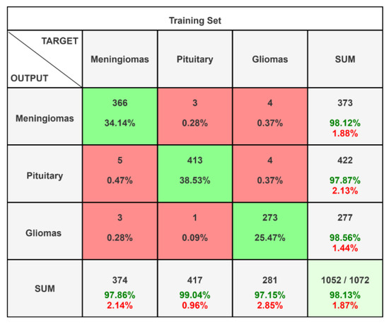 Findings of the performed brain tumor applications in Scenario 1: 5 healthcare institutions. The green color represents correct classifications, and the red color represents errors.