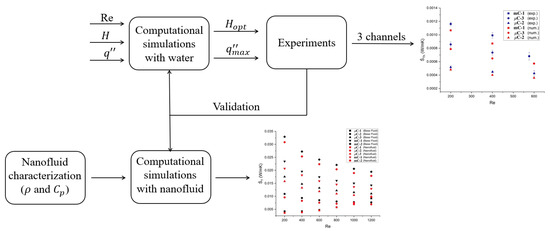 Similar studies have implemented the direct metal laser sintering (DMLS) technique for fabricating MCHS using water as a coolant. In these works, the authors analyzed the effect of the Re number in the laminar regime using MCHS with hydraulic diameters of 500 (m) [30] and 690 (m) [31]. The problem with DMLS is that it produces rougher surfaces, making it difficult to control other geometric parameters [32]. In the present work, we present experimental results for hydraulic diameters of 666, 587, and 1000 C. Furthermore, the validated model provides the basis for a series of computational simulations using an aqueous-based nanofluid with reduced graphene oxide decorated with silver. Figure 1 illustrates the methodology of the work, which integrates two computational stages involving water and nanofluids, as well as an experimental stage that allows for the exploration of using a low-cost 3D printer to manufacture MCHS.