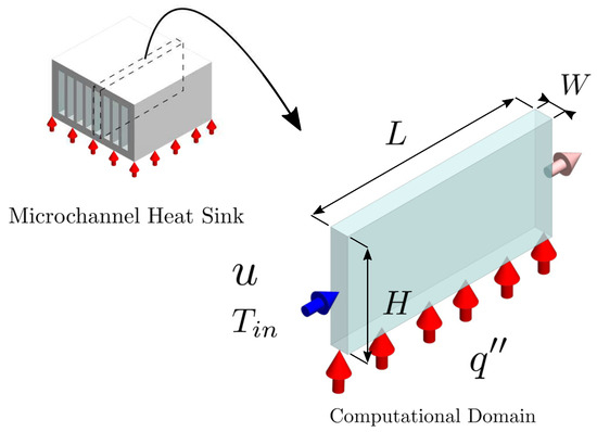 Before manufacturing microchannel (C) or minichannel (mC) heat sinks, eight rectangular cross-sectional channels were considered to computationally predict their entropy generation and explore the thermal limits of using 3D printed resin channels. The channels consisted of three Cs and five mCs. Figure 2 shows the physical situation in which an individual channel corresponds to the computational domain. Despite the simplicity of this computational domain, Chej et al. [33] demonstrated that for Re > 100, a simpler adiabatic model yields results very similar to those of conjugate models with convective and radiative boundary conditions. The width (W) and length (L) of the channels were kept constant for all cases: 1 mm and 50 mm, respectively. Table 1 shows the channels’ heights (H) considered for the optimization study.