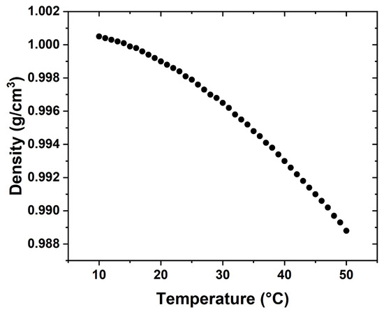 Since the study aims to predict how the addition of rGO-Ag nanoparticles to the coolant (water) affects the generation of thermal entropy and how the viscosity of the nanofluid influences the generation of frictional entropy, the nanofluid corresponds to rGO-Ag based on water with a concentration of 0.1 wt.%. The synthesis of this nanofluid is presented in the work of Lozano-Steinmetz et al. [35] in which the thermal conductivity and dynamic viscosity were measured (Equations (6) and (7)). In the present study, we used the same nanofluid whose density was measured with respect to temperature using an Anton-Parr (Graz, Austria) density meter model DMA 4101. Measurements were made in triplicate from 10 to 50 °C with steps of 1 °C (Figure 3). The equation that models the density of the nanofluid as a function of temperature is presented in Equation (8), with a coefficient of determination of .