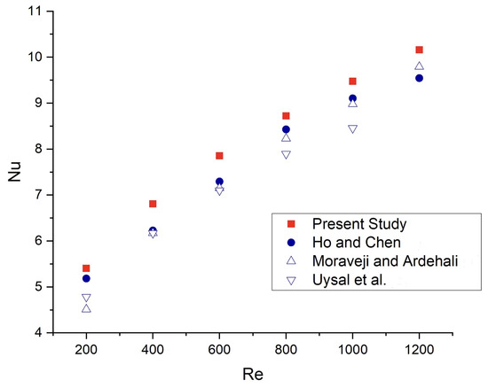 Comparison of the present numerical results with those obtained by Ho and Chen [39], Moraveji and Ardehali [40], and Uysel et al. [41].