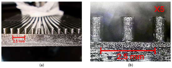 The channels were manufactured using a photosensitive resin 3D printer, specifically a Creality LD-002R printer (Shenzhen, China), and LCD resin of the same brand. Unlike filament 3D printing (PLA), this process utilizes an ultraviolet screen to harden the resin layer by layer, with an adequate resolution for the application (75 m XY that defines the smallest reproducible detail in the horizontal plane and 20 m Z, which determines the layer thickness that affects vertical smoothness), at a speed of 20 mm/h and a nominal power of 72 W. The procedure began with calibrating the printing platform, ensuring its correct alignment with the LCD screen through manual adjustments and the use of a sheet of paper as a reference. Subsequently, the resin was poured into the printing container, ensuring safety measures. Then, the printing file was loaded and the manufacturing process was started, which was carried out in a ventilated environment due to the emission of gases. Once the printing was finished, the piece was carefully removed from the platform with a metal spatula, and excess resin was removed by cleaning with isopropyl alcohol. This process enabled the precise manufacturing of the channels, ensuring their correct geometry and surface quality. Photosensitive resin 3D printing yields good results on a small scale, offering a surface finish superior to other additive manufacturing (AM) methods, as illustrated in Figure 5a. The fabricated channels correspond to C-2, C-3, and mC-1. These channels minimize the entropy generation for the analyzed heat fluxes, as shown in the computational simulations carried out with water as coolant. Multiple parallel channels with walls 0.5 mm thick were constructed, as shown in Figure 5b.