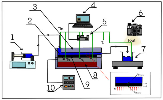 Experimental setup for the analysis of the thermal performance of the channels. (1) Syringe pump, (2) electrical heaters, (3) channel containment system, (4) PC, (5) data collection DAQ, (6) camera, (7) precision balance, (8) thermal insulator, (9) channels, and (10) power supply.