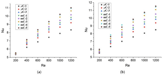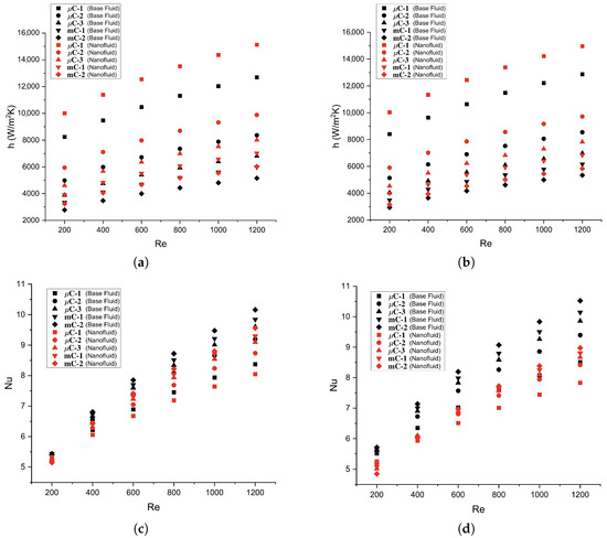 Figure 13c,d show the behavior of the Nusselt number with respect to the Reynolds number. At a heat flux of 10 kW/m2, the Nusselt number decreases from 1.17 to 5.9% regarding the base fluid, which is more pronounced for larger channels and higher Reynolds numbers. By interpreting the Nusselt number as