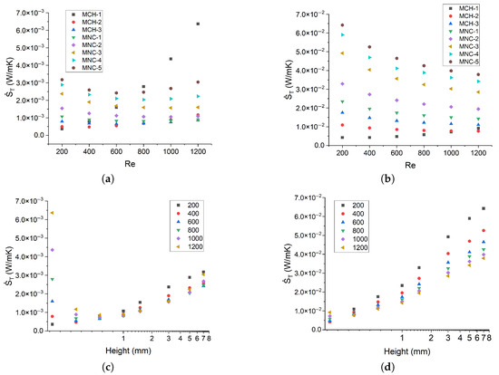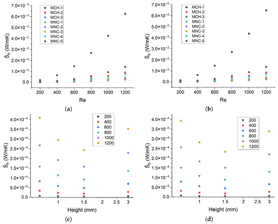 Numerically predicted total entropy generation: (a,b) results for heat fluxes of 10 kW/m2 and 50 kW/m2, respectively; (c,d) total entropy generation as a function of channel height for the same heat flux values, with Reynolds number as a parameter.