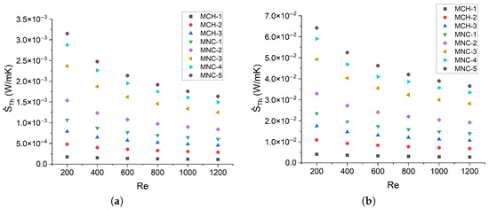 Figure 9 shows the thermal entropy generation in relation to the Reynolds number, where a decreasing trend can be observed for both heat fluxes. The channels C-1, mC-1, and mC-5 exhibit differences of 53.03%, 76.84%, and 92.64%, respectively, between Re = 200 and Re = 1200 under a heat flux of 10 kW/m2. However, for a heat flux of 50 kW/m2, the differences for the same channels drop to 48.88%, 67.82%, and 75.81%, respectively. Although the trend is similar, there are significant differences between the results because higher heat fluxes increase the irreversibilities and the thermal entropy generation.