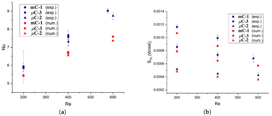 Figure 11a shows the experimental and numerical results of the Nusselt number for channels mC-1, C-3, and C-2. It can be observed that there is an increasing discrepancy between the numerical and experimental results regarding the Reynolds number. For Re = 200, there is an average difference of approximately 8.5% between the numerical and experimental results, increasing to 13% and 18.7% for Re = 400 and Re = 600, respectively. The thermal entropy generation shows differences of the same magnitude as those presented by the Nusselt number. Figure 11b presents the experimental and numerical results of thermal entropy generation for the minichannel mC-1 and the microchannels C-3, C-2. The percentage differences between the numerical and experimental results may indicate that some aspects were not adequately considered during the simulations, especially at higher Reynolds numbers. For example, viscous dissipation was not included in our mathematical model, while in other numerical works [46] with microchannels, the viscous dissipation term has been included. Koo and Kleinstreuer [34] compared the magnitudes of each term that governs the thermal energy equation and found that the viscous dissipation effect increases as the channel size decreases. Therefore, for smaller microchannels, this effect may be a consideration.