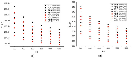 The temperature of the wall is crucial to determine the convective heat transfer coefficient and the generation of entropy. As shown in Figure 12, when comparing the nanofluid with the base fluid at a heat flux of 10 kW/m2, only minor differences (0.05 to 0.2%) were observed. No significant influence of the working fluid can be reported, which is especially true for C-1, where the effect on the wall temperature is not greater than 1 K. For a heat flux of 50 kW/m2, there is also no considerable influence when changing the working fluid, with percentage differences ranging from 0.25% to 0.32%.