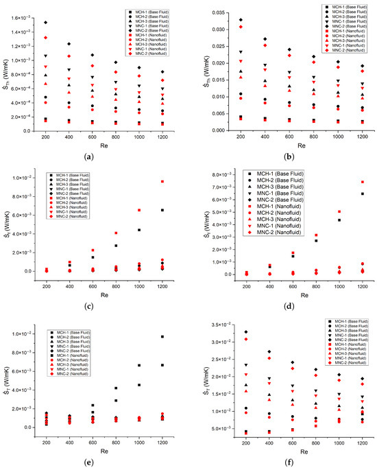 Other authors have noticed that nanofluids minimize entropy generation at lower Reynolds numbers [28], especially compared to other coolants (air and ammonia) [47]. The addition of nanoparticles significantly decreases the generation of thermal entropy [48], but according to other authors [27,49,50], the frictional entropy increases slightly with the addition of nanoparticles. Manay et al. [22] experimentally studied the effect of aqueous nanofluids with TiO2 nanoparticles. They found a similar decreasing trend of thermal entropy with the Reynolds number 100–750 for different concentrations of nanoparticles and microchannel heat sink heights, but values one order of magnitude higher than ours. Adio et al. [51] numerically studied an interrupted microchannel heat sink with rib turbulators using Al2O3–water nanofluids. The authors observed a similar trend in thermal entropy within a comparable range of Reynolds numbers (100–700).