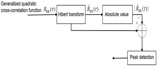 The Hilbert transform [15] has the property of transforming an even function into an odd function, so the peak detection of the cross-correlation function can be transformed into zero-crossing detection. This detection method is capable of diminishing noise interference and enhancing the precision of time delay estimation. However, due to the presence of environmental noise, some spurious zero points may appear. To solve this problem, this paper subtracts the cross-correlation function from the absolute value of the cross-correlation function after Hilbert transform. This method retains the peak points of the cross-correlation function and makes them sharper. This method can improve the accuracy of estimation. The block diagram of the Hilbert transform is shown in Figure 2 [11]. The derivation formula is as follows.