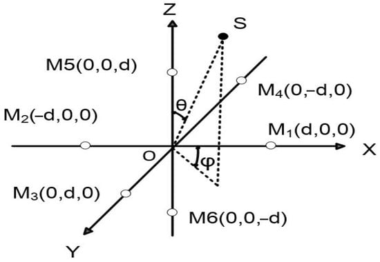 To verify the performance of the improved algorithm in sound source localization, a simulation experiment for sound source localization was conducted using the improved algorithm. The model is a six-element cross-shaped microphone array, as shown in Figure 5. The coordinates of the microphones are M1 (d, 0, 0), M2 (−d, 0, 0), M3 (0, d, 0), M4 (0, −d, 0), M5 (0, 0, d), and M6 (0, 0, −d). The radius d of the microphone array is 0.3 m, the signal sampling frequency is 48 kHz, the sound source position parameters are (15, 33°, 20°), and the signal-to-noise ratio is set to 5 dB.