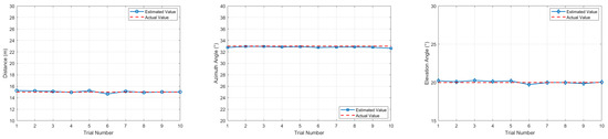 Figure 6 shows the localization results of distance, azimuth angle, and elevation angle. The blue solid line represents the estimated values by the algorithm, while the red dashed line represents the true values. It can be visually observed from the figure that the estimated values of the three localization parameters highly coincide with the true values in each trial, and the estimated values of each parameter show minimal fluctuations in 10 trials, demonstrating excellent repeatability and consistency. This indicates that the proposed algorithm can stably and accurately restore the distance, azimuth angle, and elevation angle information of the sound source in three-dimensional space. Even in the face of random noise interference in multiple independent trials, it can maintain extremely low localization errors, fully verifying the reliability of the algorithm in sound source localization.