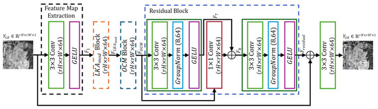 where is the output from the OCM module (see Equation (10)), is a convolution, , and are convolutions with padding of 1 pixel, represents the GELU activation function, is a group normalization layer with 8 groups and 64 channels, and is the reconstructed channel output. A point worth mentioning is that Equations (11)–(14) represent a block of 78,849 trainable parameters.
