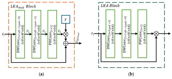 The original LKA block [21] was designed to enhance the extraction of contextual features. Its architecture is based on a sequence of three convolutions that capture information at different scales before undergoing spatial refinement. As shown in Figure 2, the design employs a combination of depthwise and pointwise convolutions, effectively balancing computational complexity with the feature extraction process.