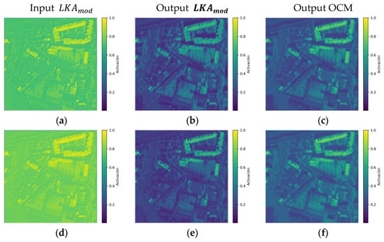 To address this, the convolutional layers have been reorganized, as illustrated in Figure 2a. This modification enables more efficient capture of spatial context from the initial stages and allows for the extraction of refined features with reduced redundancy. By using depthwise separable convolutions, the number of operations and memory usage are significantly reduced. In particular, the proposed LKAmod block decreases the number of parameters from 8832 in the original design to 8000, representing an approximate 9.42% reduction, without compromising the model’s ability to extract global spatial relationships or the quality of image reconstruction.