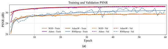 To increase the number of training samples without affecting the image information, a patch segmentation of 64 × 64 pixels with a stride of 41 pixels was applied. The HR images ( pixels) and their corresponding LR versions were divided into patches. The remaining pixels were discarded to maintain a uniform patch size. This strategy increases data diversity while preserving spatial coherence and the integrity of visual information. Moreover, this technique enables the extraction of multiple meaningful regions from each image, improving the model’s learning efficiency. Additionally, data augmentation strategies were employed during training, including 90°, 180°, and 270° rotations, as well as horizontal and vertical flips, to enhance the model’s robustness. A point worth mentioning is that the training set was divided using the random split function of PyTorch’s utils module to obtain 20% of the samples for validation purposes and the remaining samples for training.