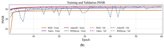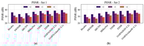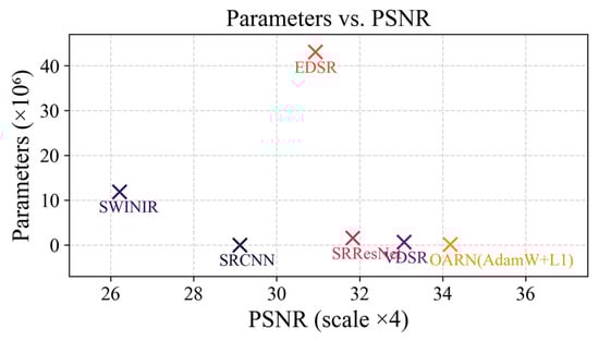 Although the proposed method has a higher number of parameters compared to SRCNN, which exhibits low computational complexity with only 8129 parameters and significantly lower reconstruction quality, the scatter plot in Figure 10 shows that OARN (AdamW + L1) achieves a higher PSNR while using considerably fewer parameters than deeper models such as EDSR. Therefore, although the proposed method involves greater complexity than some simpler models, it achieves a more efficient balance between quality and computational cost, making it a better overall alternative.