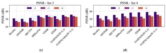Compared to VDSR, OARN (AdamW + L1) showed an average improvement of over dB across all test sets at scale , demonstrating superior capability in recovering fine structures under conditions of spatial information loss. Similarly, concerning SRResNet, OARN achieved gains ranging from to dB, highlighting its efficiency without requiring an excessively deep network.