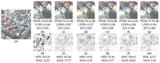 The quantitative analysis shown in Figure 6 demonstrates that the proposed model, OARN (AdamW + L1), achieves the highest PSNR values across all test sets and scale factors. To complement these results, a comparative qualitative analysis was conducted using reconstructed images from test sets 3, 1, and 2, evaluated at a scale factor. These scenes are presented in Figure 7, Figure 8 and Figure 9, respectively, and were selected due to their high complexity and rich textures. They include elements such as buildings, trees, and roads, which introduce numerous edges and fine structural details. Such characteristics pose greater challenges for SR models, making them ideal for visually assessing the model’s ability to preserve details and accurately reconstruct complex patterns. To visually assess the differences in reconstruction quality, error maps were generated for each of the compared methods. These maps were obtained by computing the inverse absolute difference between the original HR image and its corresponding reconstruction in the cropped region. The error was normalized between 0 and 1 and subsequently inverted to highlight more accurate regions in lighter tones. The visualization corresponds to the average absolute error across the three RGB channels, multiplied by 255 for display in greyscale.