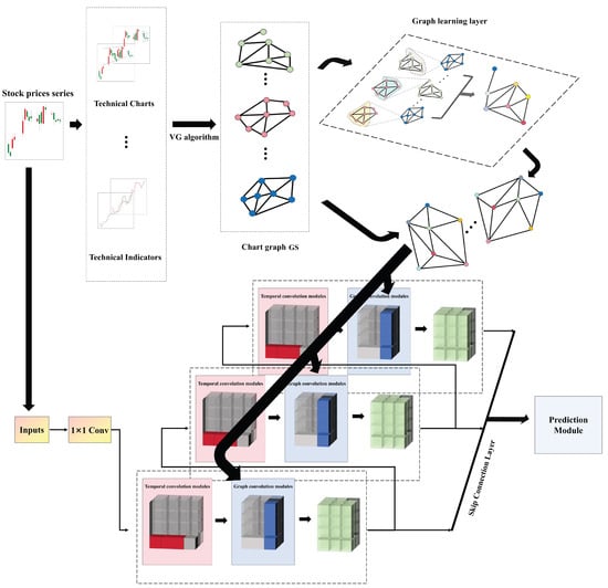 Lately, the progress in deep learning has brought GNNs to the forefront as a powerful method for handling dependency relationships between different entities and temporal dynamics. Graph neural networks operate under the assumption that node status is influenced by the status of its neighboring nodes. In order to grasp such spatial dependencies, researchers have devised a range of graph neural networks utilizing techniques such as message passing [], information propagation [], and graph convolution []. These networks function similarly, fundamentally capturing advanced node representations by disseminating the states of neighboring nodes to the nodes themselves. Existing studies often utilize knowledge graphs to store and depict these relationships. For example, a study organizes industry relationships among entities into knowledge graphs and predicts stock movements by utilizing graph networks []. Additionally, researchers also construct multi-modality graph neural networks using historical stock price sequences, media news about companies, and correlative events []. However, the actual graph will frequently change over time along with fluctuations in the financial markets. The graphs constructed by the aforementioned methods are limited by the unaltered, predefined relationships chosen subjectively by researchers. Furthermore, the graph construction methods mentioned above do not incorporate technical charts and indicators. Therefore, existing methods do not fully utilize all the information in the stock data. Furthermore, some researchers have attempted to design a class of universal GNN frameworks for multivariate time-series data []. This method automatically extracts relationships among variables using the graph learning module, facilitating the integration of external knowledge, like variable attributes. Inspired by this, we can design a module in our framework to automatically learn the relationships between technical charts generated from different stock indicators. Some studies also suggest that GNNs can simultaneously capture the local and global information of the entire graph, thereby better understanding the relationships between nodes []. GNNs, by means of employing a message-passing mechanism, facilitate the dissemination of information across graph structures. Each node updates its features by incorporating information from its neighboring nodes. Additionally, it captures the local information of nodes through local convolutions and gradually integrates node features through multiple convolution layers, propagating them across the entire graph to acquire global information []. Additionally, GNNs exhibit robust scalability and adaptability, enabling them to dynamically modify both the architecture and parameters of the model to suit diverse prediction tasks and data characteristics. Thus, they are applicable to prediction tasks. Inspired by this, incorporating a GNN into our framework can fully exploit information from technical charts and indicators in predicting stock price using input stock sequences.