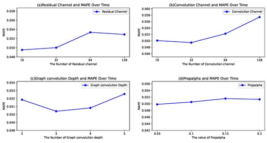 The experimental results of the parameter study are shown in Figure 2. The potential improvement in prediction performance resulting from the augmentation of convolutional channels and residual connections is contingent upon the particular task, dataset, and model architecture. In general tasks, amplifying the number of convolutional channels and residual connections may bolster the model’s expressive capacity, thereby enhancing its performance; however, this augmentation carries the inherent risk of overfitting. The broken lines in Figure 2a,b indicate that, based on the dataset we collected, an optimal configuration for achieving better results is when the number of residual channels is set to 16 and the number of convolutional channels is set to 32. However, it is noteworthy that increasing the convolutional channels and residual connections escalates model complexity, which, if not carefully managed, may lead to overfitting in the stock prediction task and consequently diminish prediction accuracy. As shown in Figure 2c, the model performs the best when the convolutional depth of the graph is set to 3. This may be because a depth of 2 is too shallow to capture the complex relationships and features in the data. Conversely, when the convolutional depth exceeds 3, it becomes too deep, leading to information propagation over excessively long distances in the graph structure. This makes it difficult for the model to effectively capture the relationships between local and global features in the input. The model performance is not sensitive to the hyper-parameter , as shown in Figure 2d, but for our model, when the is set to 0.05 the model has the lowest mean MAPE.