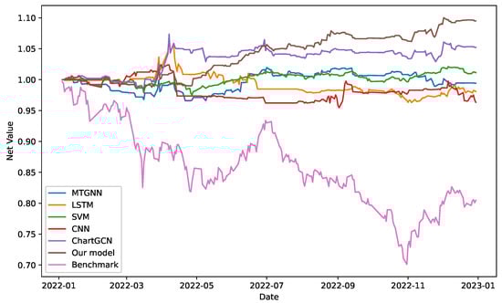 A detailed, phase-by-phase analysis of the backtest results provides further insight into the model’s robustness and adaptability. Firstly, during periods of sharp market decline (e.g., January–April and July–October 2022), the model exhibited outstanding defensive strength. While the benchmark index experienced significant drawdowns, our model’s net value remained exceptionally stable, effectively insulating the portfolio from systemic risk. Secondly, the model also proved its agility in capitalizing on positive trends. It successfully participated in the mid-year rebound (May–June 2022) and further capitalized on the year-end rally (November–December 2022), ultimately reaching its annual performance peak. This consistent performance in both worst-case (decline) and best-case (rebound) phases within a volatile year underscores the practical advantage of the CIRGNN framework.
