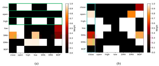For example, in Figure 4a we observe that the closing price significantly affects the opening price, highest price, EMA, and BOP in some periods. The reasons may be that, firstly, a higher closing price often indicates an upward trend in the stock, potentially continuing into the next period, thus affecting subsequent opening and highest prices. Secondly, investors interpret higher closing prices as positive market sentiment, leading to buying tendencies at market open, consequently influencing opening and highest prices. Finally, higher closing prices tend to elevate EMA and bias BOP towards buying, explaining their correlations. Similarly, the highest price notably influences the opening price, lowest price, SMA, and BOP. This is due to the highest price reflecting strong demand, impacting trader sentiments and subsequent price movements []. Moreover, SMA calculations are sensitive to the highest price, causing shifts in trend patterns. Lastly, changes in the highest price affect traders’ sentiments, influencing the buying and selling forces reflected in the BOP indicator.