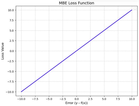 The mean bias error loss (MBE) is a basic numerical loss function [30], which captures the average deviation in the prediction. However, it is rarely used as a loss function to train regression models as positive errors can offset negative ones, potentially causing incorrect parameter estimation. It serves as the starting point for the mean absolute error loss function and is commonly used to evaluate model performance. The mathematical formula of MBE is shown in Equation (2):