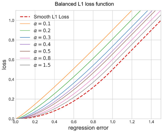 where is the regression error; is the parameter that controls the gradient boost for inliers; a smaller α enhances the gradient for inliers without affecting the values of outliers; the parameter limits the maximum gradient for outliers; is a constant determined by α and , which must satisfy ; is the constant term that is used to ensure that the function is continuous at . The function curve of balanced L1 loss is shown in Figure 5.