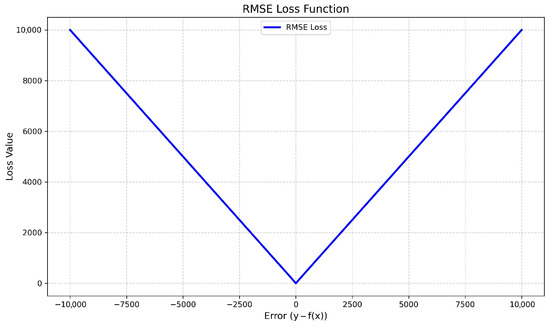Root mean squared error loss (RMSE) is the square root of MSE [16]. It explains the changes in the actual values and measures the average magnitude of the errors. The square root makes the penalty of RMSE for error less than that of MSE. Even if the error is large, the loss of RMSE is relatively small. The mathematical formula of RMSE is shown in Equation (8):