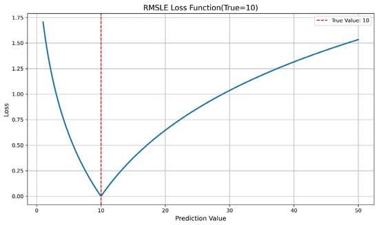 Root mean squared logarithmic error loss (RMSLE) processes the difference between the predicted value and GT through logarithmic transformation. It is applicable to scenarios where the data has a skewed distribution or outliers [33]. The logarithmic function compresses the numerical range of large errors and reduces the impact of outliers on the overall error. Furthermore, it adopts an asymmetric punishment mechanism. When the predicted value is lower than GT, the punishment of RMSLE is more severe. When the predicted value is higher than GT, the penalty is lighter. Its mathematical formula is shown in Equation (9):