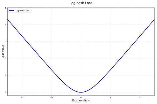 When the error is small (), the loss is , which is similar to MSE and emphasizes precise fitting. When the error is large (), the loss is , which is similar to MAE and reduces sensitivity to outliers. Log-cosh loss combines the smoothness of MSE and the robustness of MAE to outliers, avoiding excessive punishment for large errors while maintaining the optimizability of the loss function. The function curve of log-cosh loss is shown in Figure 8.