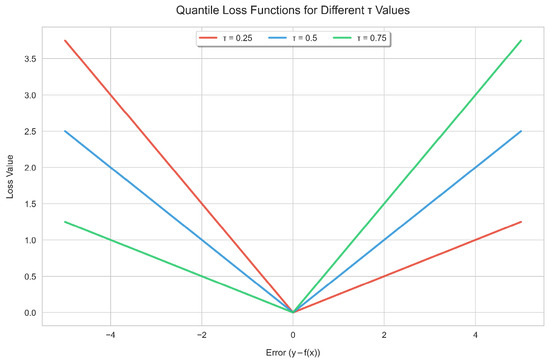 This asymmetry allows the model to adjust its focus on overestimation or underestimation flexibly. In the case of underestimation, the first part of the formula will dominate, and in the case of overestimation, the second part will dominate. Different penalties are given for over-prediction and under-prediction based on the chosen quantile value. The function curves of quantile loss for different values are shown in Figure 9. Here, takes 0.25, 0.5, and 0.75 as examples.