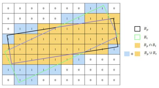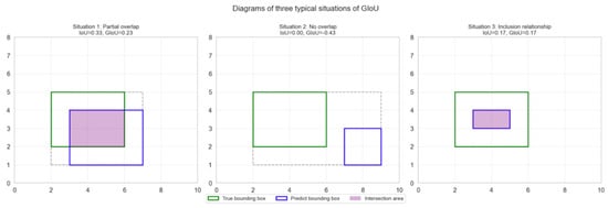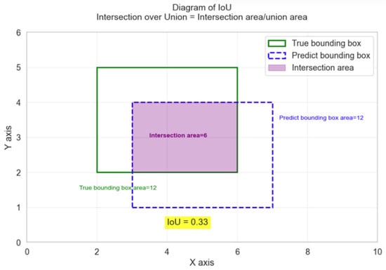 Intersection over Union (IoU) is a metric used in object detection to measure the overlap between two bounding boxes [36]. The mathematical formula of IoU is shown in Equation (12):