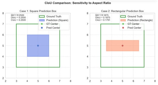In object detection tasks, the target of bounding box regression is to achieve geometric alignment between predicted bounding box and GT bounding box. Quantity difference loss only independently penalizes the numerical deviations of the coordinate points, ignoring their inherent geometric properties. Therefore, researchers have proposed geometric difference loss [25]. This loss directly optimizes the geometric Intersection over Union (IoU) between predicted box and GT box, which is also the core metric for evaluating detection accuracy. Geometric difference loss no longer views the coordinates as isolation but considers them as a whole geometric entity, optimizing the geometric relationship between the predicted box and the GT box.