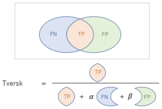 - Salehi, S.S.M.; Erdogmus, D.; Gholipour, A. Tversky loss function for image segmentation using 3D fully convolutional deep networks. In Proceedings of the International Workshop on Machine Learning in Medical Imaging, Quebec City, QC, Canada, 10 September 2017; Springer International Publishing: Cham, Switzerland, 2017; pp. 379–387. [Google Scholar]