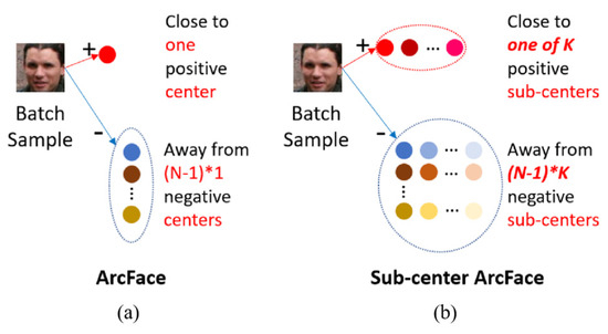 - Deng, J.; Guo, J.; Liu, T.; Gong, M.; Zafeiriou, S. Sub-center arcface: Boosting face recognition by large-scale noisy web faces. In Proceedings of the European Conference on Computer Vision, Glasgow, UK, 23–28 August 2020; Springer International Publishing: Cham, Switzerland, 2020; pp. 741–757. [Google Scholar] [CrossRef]