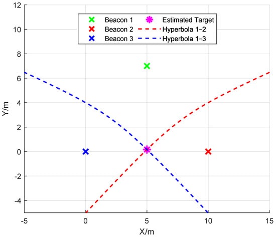 In a 2D plane (X-axis and Y-axis), the TDoA localization algorithm estimates the localization of the target by measuring the time differences of signals arriving at different beacons. Assume there are three beacons: beacon 1, serving as the reference beacon, with beacon 2 and beacon 3 functioning as localization beacons. Let the coordinates of the target be ; the coordinates of beacon 1, beacon 2, and beacon 3 be , , and , respectively; and the signal arrival times at each beacon be , , and . The signal propagation speed is denoted by c (typically the speed of light). Using beacon 1 as the reference, the following two time difference equations can be derived [21]: