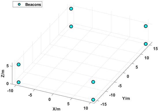 A 3D localization environment is shown in Figure 2, where a total of eight beacons are set up, positioned at each of the eight corners of the cubic localization area. In the simulation experiment, we set the coordinates of the eight beacons as , , , , , , , and . The coordinates of the localization point are set as .