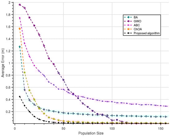 To investigate the impact of optimization algorithm parameters on algorithm performance, we design a localization accuracy experiment based on different population sizes, with the LOF neighbor count parameter (k) set to 3 in this simulation. As shown in Figure 4, for the four optimization algorithms and the proposed algorithm, we conducted localization accuracy tests with various population sizes ranging from 5 to 160, with a step size of 5, and added Gaussian white noise with a standard deviation of m to the simulation. According to the experimental results, we found that among the four optimization algorithms, ChOA has the fastest convergence speed and the highest localization accuracy after convergence. Moreover, the proposed algorithm further improves the convergence speed with respect to population size and the localization accuracy after convergence on the basis of ChOA. In subsequent experiments, unless otherwise specified, the population size of the algorithms is fixed at 150.