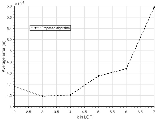 To investigate the impact of the LOF neighbor count on the accuracy of the localization algorithm, we design a simulation experiment targeting the LOF neighbor count parameter (k). In the experiment, the LOF neighbor count parameter (k) was set to range from 2 to 7 with a step size of 1. The experimental results, as shown in Figure 5, indicate that the algorithm achieves the highest accuracy when the LOF neighbor count parameter (k) is set to 3. Therefore, the LOF neighbor count parameter is fixed at 3 in all subsequent experiments.