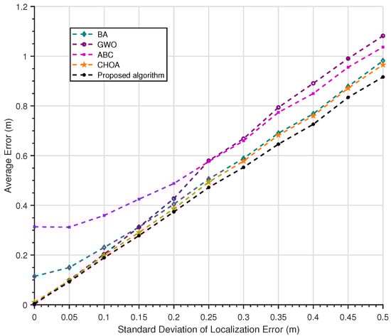 We conducted a simulation experiment involving Gaussian white noise on four optimization algorithms and the proposed algorithm. In these experiments, we tested the localization errors of different algorithms under 11 noise environments with standard deviations ranging from 0 m to m (with a step size of 0.05 m) to verify the localization performance of our algorithm in a Gaussian white noise environment. According to an in-depth analysis of the simulation results presented in Figure 6, the localization accuracy of the ChOA is significantly superior to that of the other three optimization algorithms under different error standard deviations, indicating that the localization algorithm employing the ChOA possesses favorable precision and robustness. The simulation results confirm that the ChOA not only achieves outstanding localization accuracy in typical operational scenarios but also maintains strong robustness under various error conditions, making it particularly suitable for practical applications with low to moderate standard deviations in localization error values. Meanwhile, we can also observe that the proposed algorithm further improves the localization accuracy in each noise segment on the basis of the ChOA. As shown in the figure, under various noise intensity conditions, the localization error curve of the improved algorithm proposed in this paper always lies below that of the ChOA, and it exhibits a more gradual growth trend, especially within the range of localization errors with medium and high standard deviations. The simulation data confirm that the improved algorithm is superior to the original ChOA in terms of both localization accuracy and robustness.
