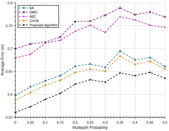 To verify the localization accuracy and robustness of the algorithm in a noise environment with multipath effects, we designed a simulation experiment for such an environment. In the experiment, we fixed the standard deviation of Gaussian white noise at m and added multipath effect noise with an occurrence probability ranging from 0 to (with a step size of ). The multipath effect generates random additional distance measurements in the range of m to m. As shown in Figure 7, with the increase in the occurrence probability of multipath effects, all types of algorithms maintain a similar fluctuation trend in localization accuracy. Moreover, the localization curves of our algorithm and the ChOA (used as the baseline algorithm) show a high degree of consistency in the multipath noise environment. This indicates that the advantages of our algorithm in noise environments are more evident in Gaussian white noise environments, while its anti-interference performance against multipath effects is comparable to that of the ChOA, which serves as the baseline.
