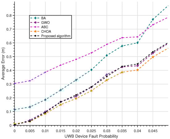 We also conducted simulation tests on UWB device faults. Since the probability of UWB device faults in real-world scenarios is extremely low, we significantly increased the probability of UWB device faults in the simulation to highlight the impact of sensor faults on the algorithm’s localization results. As shown in Figure 8, we added a UWB device fault probability ranging from 0 to 0.05 (with a step size of 0.005) to a simulation environment without other interferences and plotted the localization accuracy of different algorithms under 11 such probabilities. When a UWB device fault occurs, an error ranging from 2 m to 5 m arises. From the localization results, it is easy to observe that among the four optimization algorithms, the ChOA has the best adaptability to UWB device faults. However, the proposed algorithm exhibits slightly poorer adaptability to UWB device faults than the ChOA, so it is more sensitive to device quality than the ChOA.