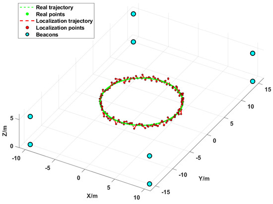 Our study conducted a simulation to validate the localization performance of the proposed algorithm. The simulation scenario is designed as follows: a circular motion trajectory with a radius of m is constructed, centered at the point expressed as in the space where the localization beacon is located. Along this circular trajectory, 150 sampling points are uniformly selected for testing. During the simulation, the standard deviation of localization error is set to m, the occurrence probability of multipath effects is set to , and the proposed algorithm is applied to perform localization calculations at each sampling point.