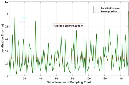 We record the localization error of each sampling point on the trajectory for this experiment. As shown in Figure 10, the localization error of each point fluctuates between 0 and 1 m, and the localization error values are mainly concentrated around the mean value of m, showing a relatively concentrated error accuracy performance.