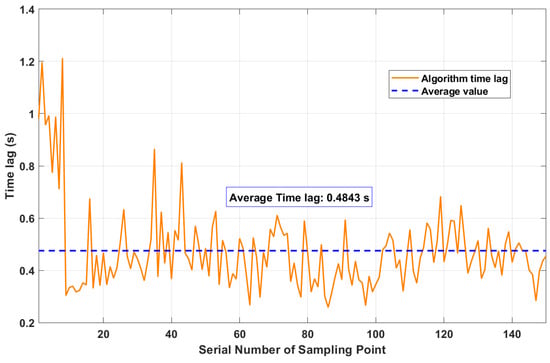 We also record the time lag of each sampling point, which represents the algorithm’s execution time and can characterize the algorithm’s time complexity. As shown in Figure 11, the time lag is relatively high at the beginning of the algorithm’s execution, possibly due to the simulation software’s CPU invocation logic. During subsequent execution, the time lag decreases and fluctuates around the mean value. The algorithm’s time lag is mainly concentrated between and s, which can meet the requirements of most localization scenarios.