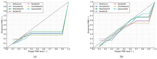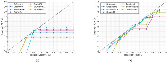 The reference dashed line in Figure 3 represents the ideal scenario where the empirical FDR () perfectly matches the target FDR level (), i.e., = . This line serves as a critical upper bound; performance is considered successful if the empirical FDR lies on or below this line. The other curves depict the empirical FDR achieved by the different backbone networks (e.g., ResNet-50 and GhostNetV3) on the test set. These empirical FDR values are calculated as follows: for each target risk level (plotted on the x-axis), the Conformal Risk Control (CRC) procedure (detailed in Section 3.4, particularly Equation (7)) is used with the calibration data set to determine an optimal decision threshold . This is then applied to the test images to form prediction sets . The empirical FDR for each backbone at that target is then computed by applying a practical version of Equation (12) to these test set predictions. This value is plotted as the y-coordinate. Notably, on the industrial-grade SIID (Figure 3b), ResNet-50 attains the highest FDR value of 0.677 ± 0.021 at = 0.7, still below the theoretical bound. The lightweight GhostNetv3 exhibits the largest FDR deviation of −0.013 (0.887 − 0.9) at , validating the impact of model capacity on control accuracy in complex scenarios. Experimental results confirm that the proposed FDR risk control method maintains high defect detection precision and meanwhile significantly reduces false positives.